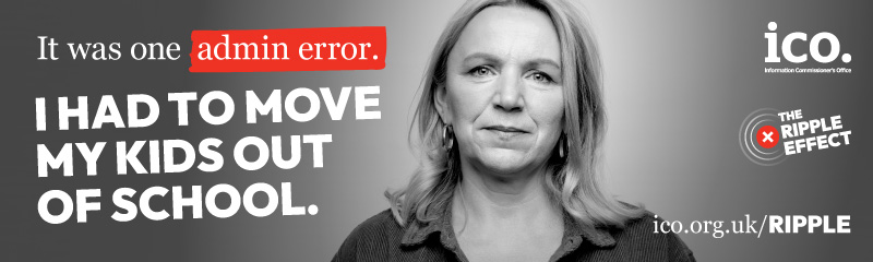 ICO poster: Black and white photo image of a lady and text: "I had to move my kids out of school'. Black text on white background: Does stress lead to data breaches? Ripple Effect . Data Protection Education logo