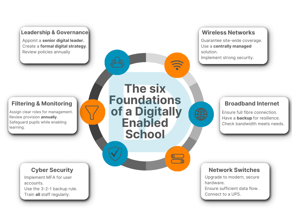 • Schools and colleges should ensure they follow the back up guidelines in the DfE Cyber Security Standards, one of the six core standards. Review our video about Backup and Recovery.